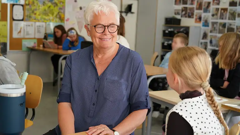 Hverken Karen eller Ole har klasserne alene. Der er altid en underviser, og så er de et supplement og en ekstra hjælp. Og det er en stor gave, at de har tid og lyst – for både elever og lærere. Det fortæller Malene Lind Gadegaard, der er skoleleder på Koldby Skole.